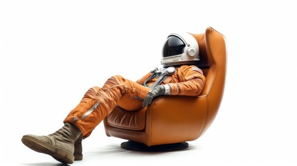 A man in an astronaut suit sitting in a chair. Suitable for space exploration themes and science fiction concepts