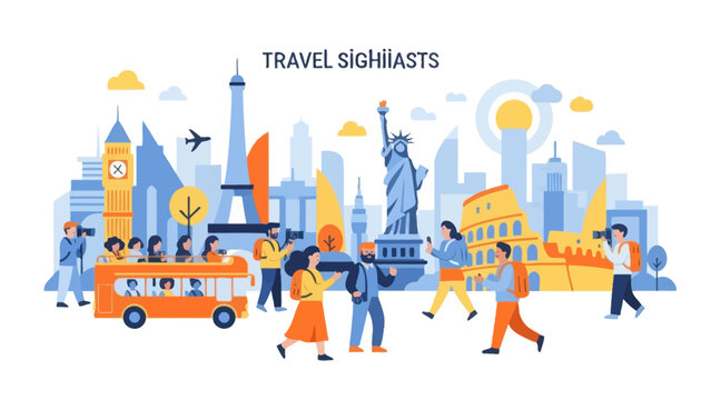 Vibrant city skyline with diverse travelers exploring iconic landmarks and