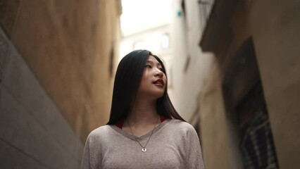 Beautiful happy tourist girl enjoying walking on old city street, summer adventure vacation in Europe.