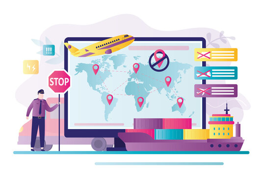 Countries have imposed sanctions against Russian. Delivery route of goods on monitor screen