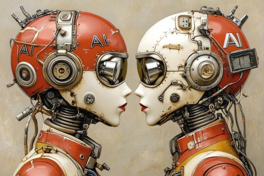 Two humanoid robots with exposed brain components facing each other symbolizing artificial intelligence cognitive interaction and the fusion of human like intelligence with advanced robotics