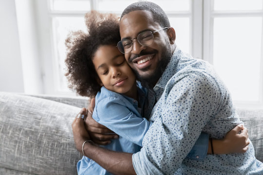 Loving African father in glasses hugs little daughter, family sitting on couch cuddling closed eyes enjoy sincere moment of tenderness, feeling bond express appreciation and gratitude for love concept