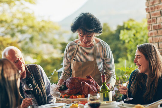 Serving, thanksgiving and woman with turkey for dinner, lunch and food on table outdoor. Happy family, usa tradition and celebration as culture, express gratitude and reflect on blessings in garden