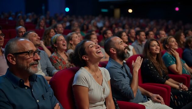 Audience laughing at a comedy festival. Red seats, camera focuses on a woman enjoying the show.