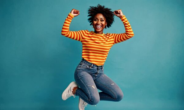 Super slow motion young black woman jumping with hands up, expressing joy and excitement, dressed casually in a fun, happy pose