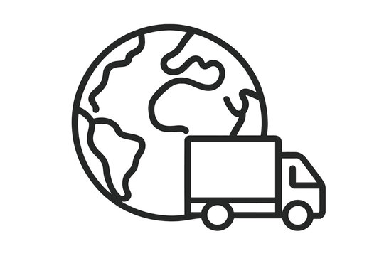 Planet Earth with delivery truck outline linear icon symbolizing global shipping transportation logistics worldwide express delivery service design vector illustration