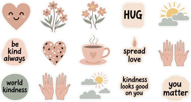 Collection of charming stickers with positive affirmations, cute illustrations, and warm greetings for expressing kindness and self-care