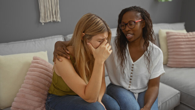 Woman comforting a crying friend sitting together on a couch in a cozy living room, displaying empathy and support during an emotional moment
