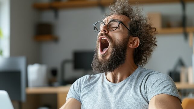 A young man with curly hair is yawning widely in an office environment, expressing fatigue and the common challenge of maintaining energy during work hours.