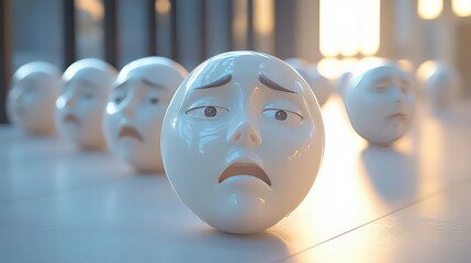 collection of white, expressionless face sculptures, with one showing a distressed emotion.