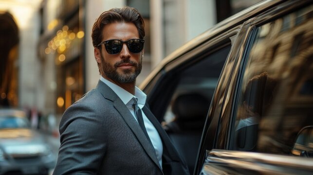 A stylish man in a suit and sunglasses, leaning on a luxury car, embodies success and will serve as an expressive backdrop for advertising premium services or fashion accessories.