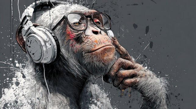 Illustration of a chimpanzee wearing glasses and headphones with a thoughtful expression