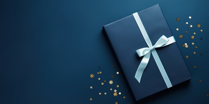 Blue gift box and notebook on dark blue background. Greeting card for businessmen. Generative AI