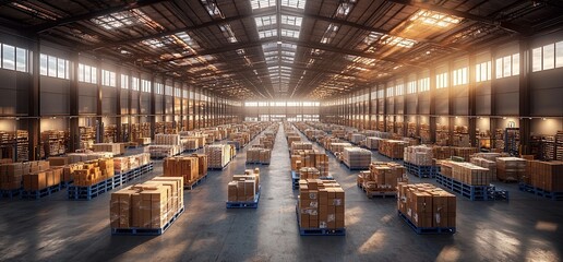 Fisheye perspective of an extensive warehouse dedicated to goods storage