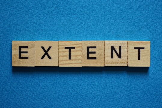 gray word extent in small square wooden letters with black font on a blue background