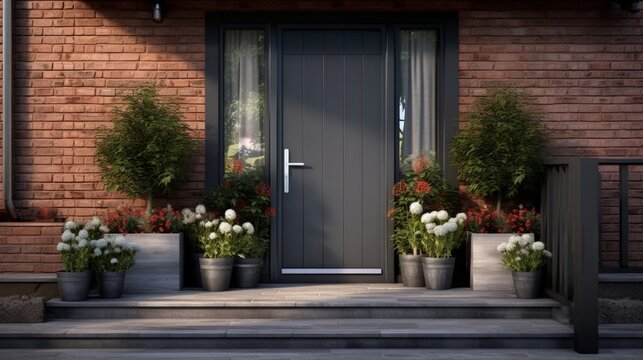 Empty brick floor square and modern concrete building exterior with stairs and glass door entrance background.