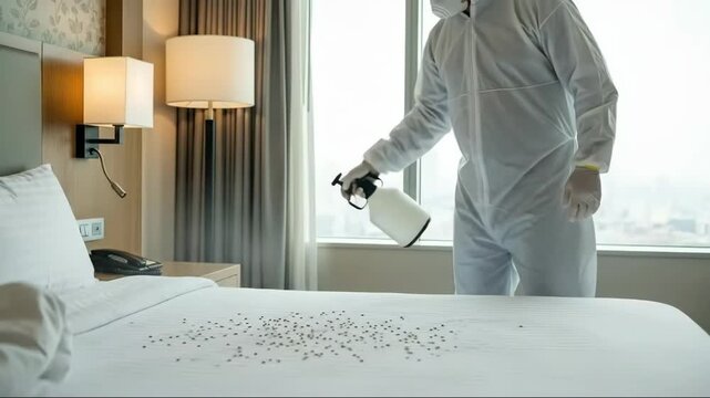 Man in protective suit spraying bed with insecticide to prevent or exterminate bed bug infestation in a hotel room