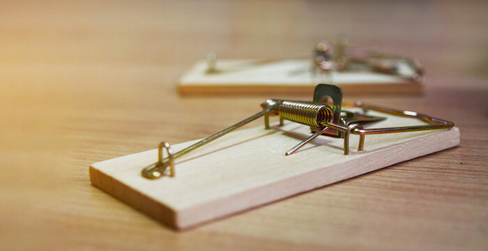 mousetraps without bait on a wooden table, as a business concept