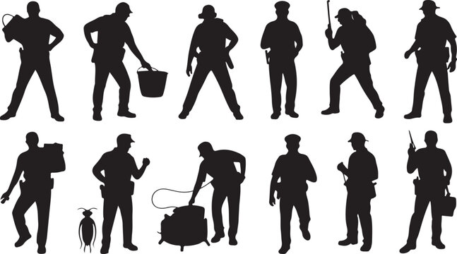 Pest control service workers in silhouettes various poses and equipment