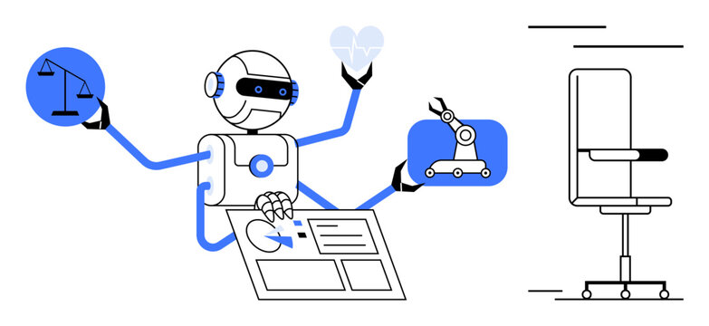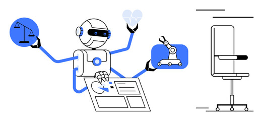 Robot with extra arms holding scales, heart, blueprint, and robotic arm operates smart systems. Ideal for technology, AI, robotics, healthcare justice design education. Simple flat metaphor