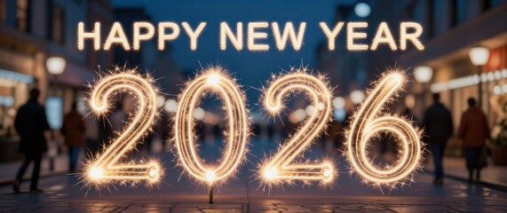 Celebratory new year countdown event city street festive display nighttime vibrant atmosphere 2026 sparkler extravaganza