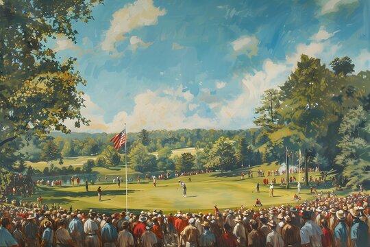 A vibrant painting of a golf tournament, featuring a large crowd gathered around a lush green course under a blue sky, with an American flag prominently displayed.