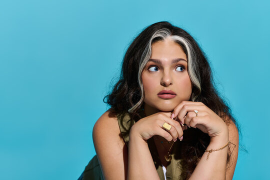 Glamorous woman promoting a beauty channel with captivating gaze