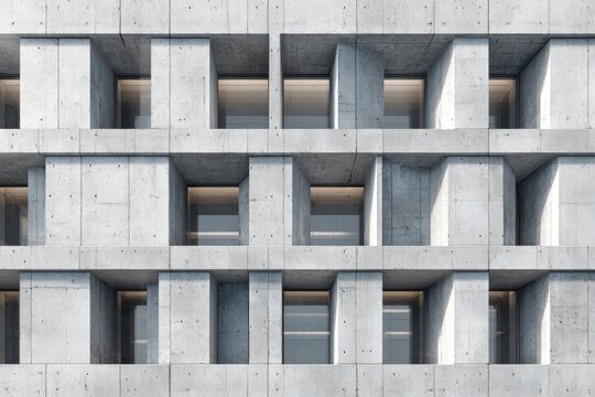 A modern concrete building stands tall, its windows recessed within the structure, creating a play of light and shadow. The building exudes modern style.