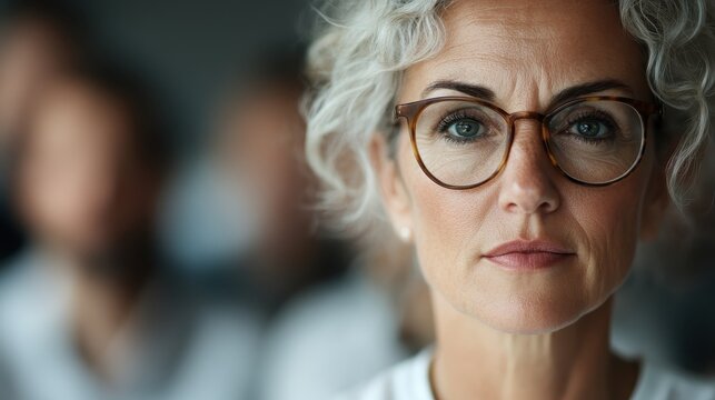 A close-up portrait of a confident woman wearing stylish glasses, exuding poise and intelligence, inspiring others with her strong presence and thoughtful expression.