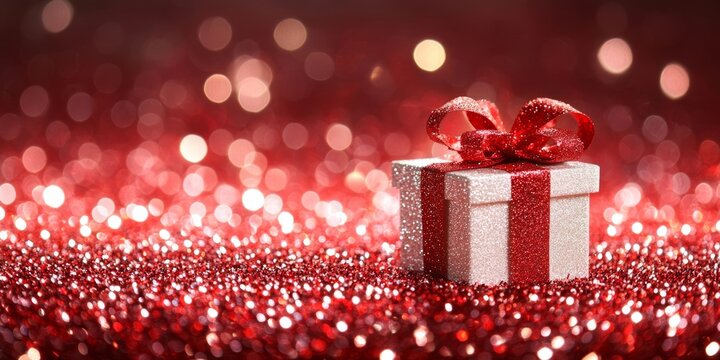 A beautifully wrapped gift box adorned with a vibrant red bow, resting on a glossy surface, exuding festive charm and anticipation for Christmas celebrations.