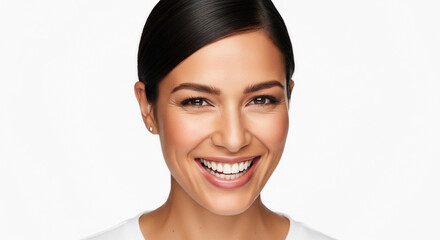 A captivating studio portrait showcasing a beautiful young woman with a radiant, genuine smile, exuding happiness and positive energy on a clean white background