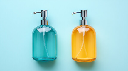 Colorful soap dispensers on a blue background create a vibrant display