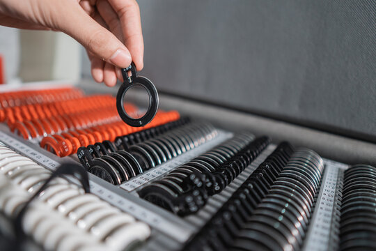 an eye doctor's hand is taking a test glasses lens gauge in a box containing a set of lenses in an eye clinic