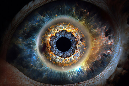 realistic human eye with galaxy inside detailed close up, new quality universal colorful joyful stock image illustration wallpaper design, generative ai