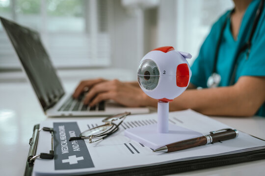 A physician performing an eye examination using an anatomical eye model and providing professional consultation and treatment in a medical setting to ensure proper diagnosis and vision care.