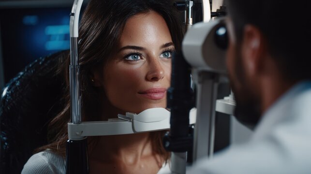 Side view of a patient seated calmly in an optometry suite while an eyecare specialist carefully aligns a phoropter medical equipment subtly highlighted by ambient lighting.