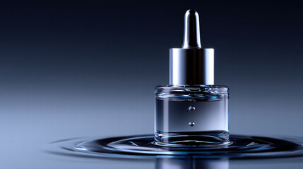 Water purity symbol for skincare branding with clear serum bottle and dropper on reflective surface with ripples