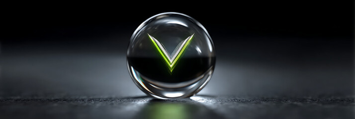 A translucent glass orb on a dark surface features a vibrant green glowing "V" symbol within, representing technology, innovation, and futuristic concepts.