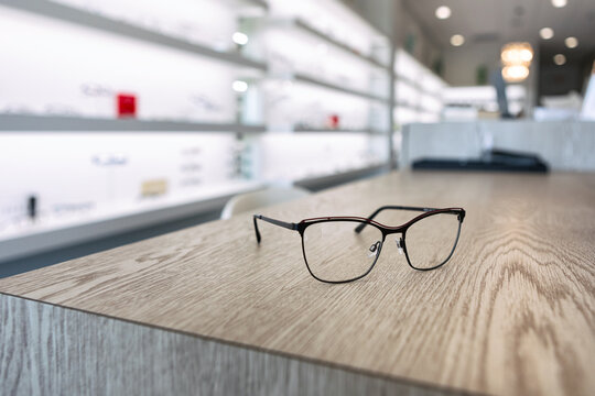 A blurred background of shelves with eyeglass frames, display cases, and optic equipment focuses on a pair of stylish eyeglasses on a pedestal in the center.