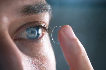Close-up of a man putting contact lenses on blue eye. Concept of: healtcare, optic, hydration of the eye.