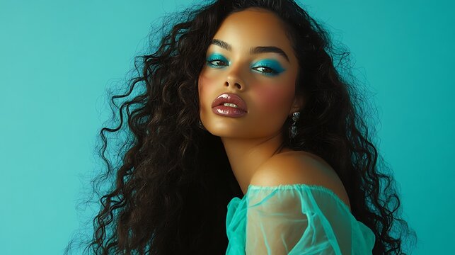 A young woman with long curly hair, wearing blue eyeshadow and a turquoise top, looks at the camera on a blue background.