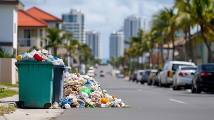 A busy urban street with overflowing garbage bins, trash piling up around them, creating an eyesore and health hazard