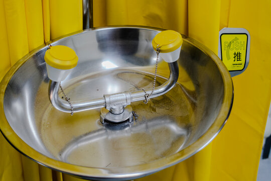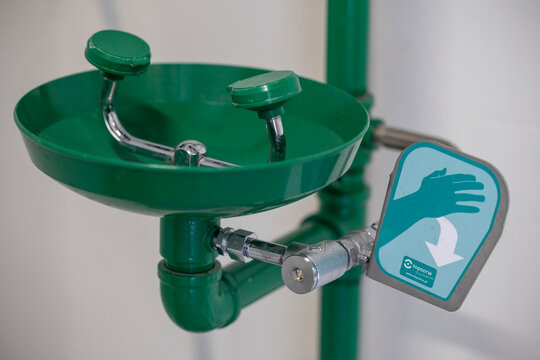 Emergency eyewash stations in the safety of workers with water flowing in laboratory or manufacturing facility.