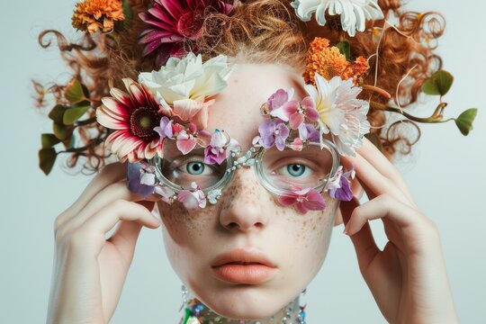 Woman Wearing Glasses With Flowers in Her Hair. Generative AI