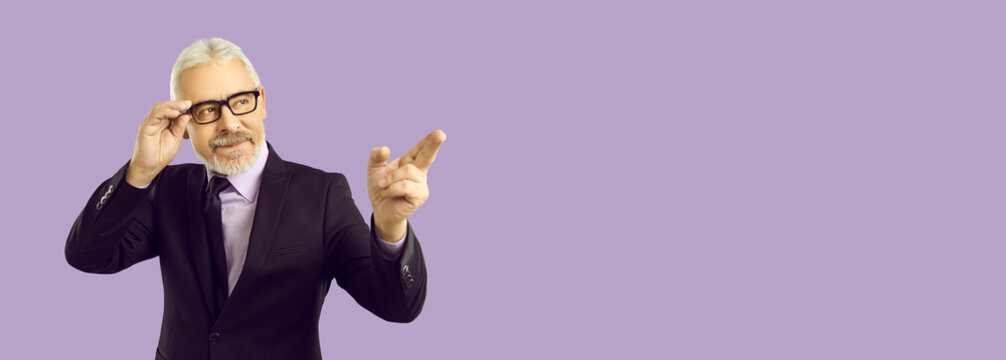 Handsome senior businessman shows something on lilac banner background. Mature business man in stylish suit and glasses looks away and points his index finger at blank text copy space on right side