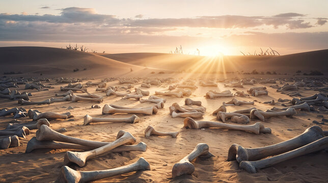 Ezekiel stands in valley filled dry bones as they miraculously come together and are covered flesh glowing sky. atmosphere conveys awe and resurrection.