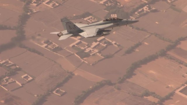 F/A-18 fighter jet flies over rural Afghanistan.