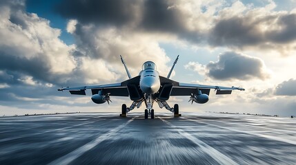 F/A 18 Super Hornet on Aircraft Carrier Deck. Concept of Military Power, Aviation, and Naval Aviation.