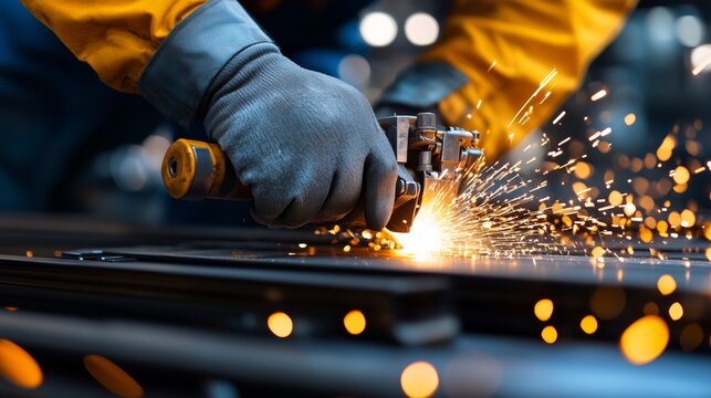 A worker skillfully cuts metal using a tool, creating vibrant sparks that brighten the dim workshop.