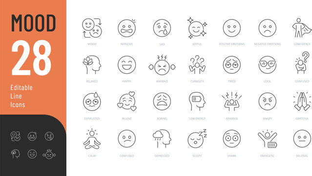 Mood Editable Icons set. Vector illustration in modern thin line style of human emotions related icons: happy, sad, nervous, and more. Isolated on transparent background.
